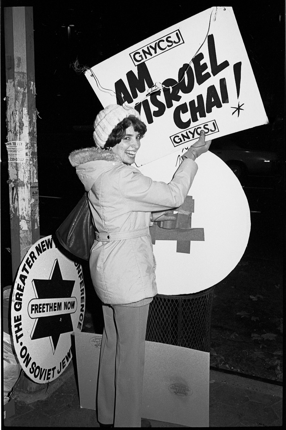 Arlene Agus preparing for a Greater New York Conference on Soviet Jewry rally at Lincoln Center, winter 1976/1977. Photograph by Bill Aron. Courtesy of Bill Aron.