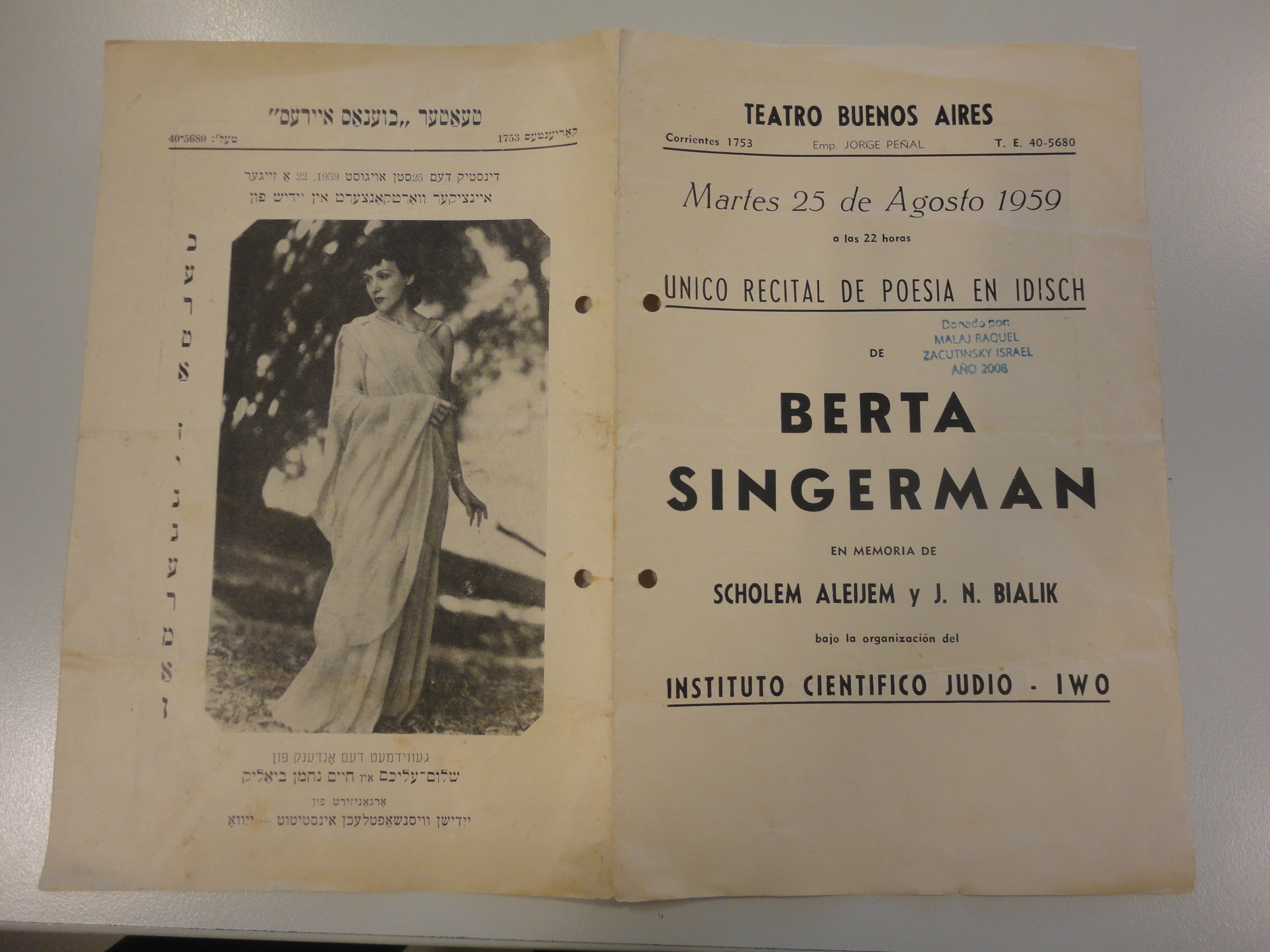Cover of program for Argentine actress and poetry reciter Berta Singerman's 1959 program in memory of Scholem Aleichem and Chaim Nachman Bialik. Courtesy of Dr. Paula Ansaldo.