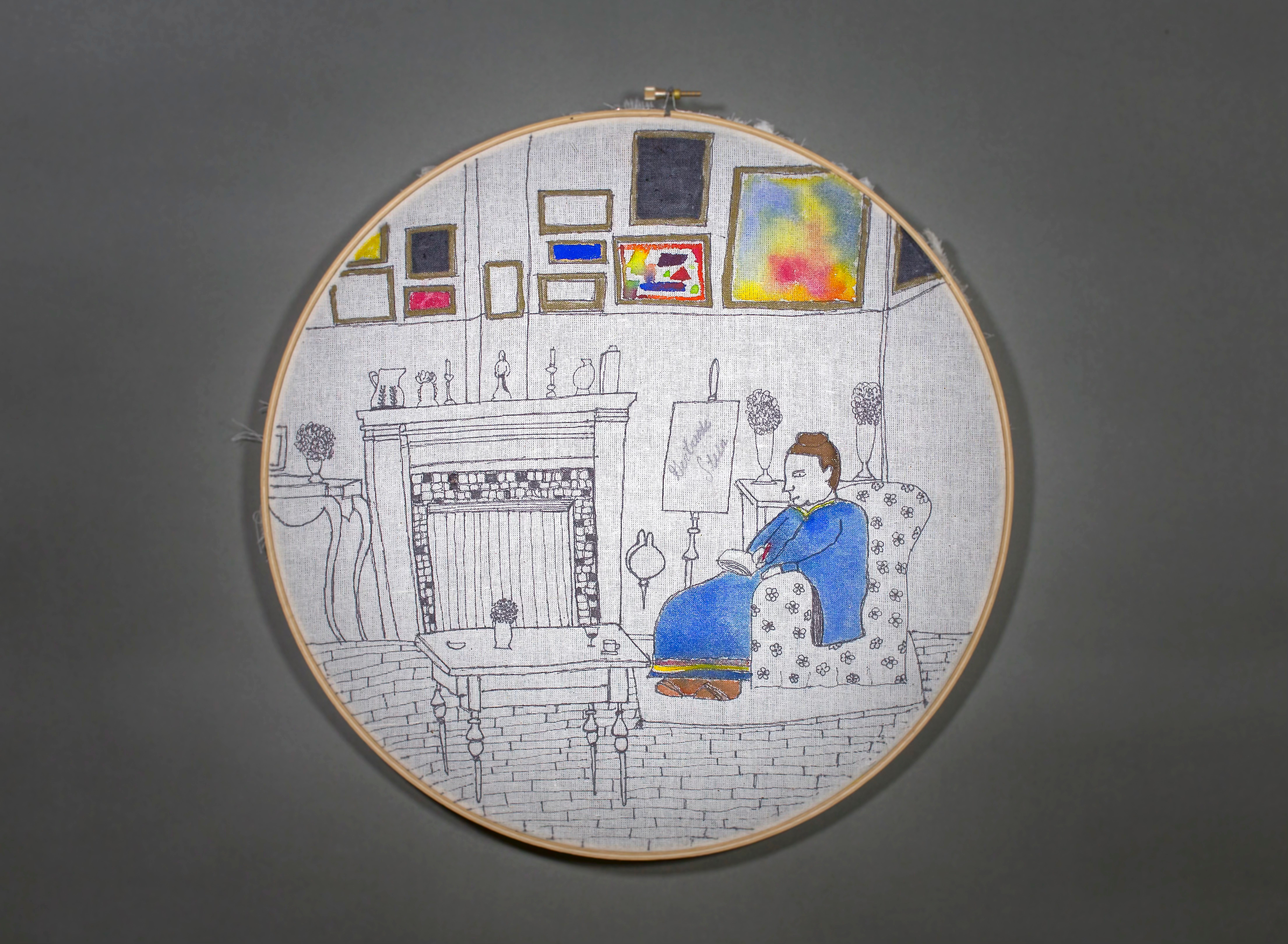 Embroidery hoop artwork honoring writer Gertrude Stein, created by Rachel Jones, as part of the Artful Disclosure: Going Through Hoops workshop led by Barbara Rosenblit and Sheila Miller. Photo courtesy of Rosenblit and Miller.