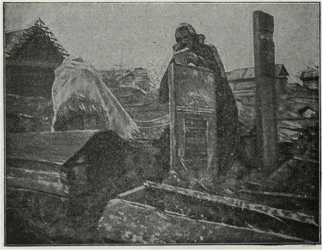 Caption: A woman measuring a grave in South Russia (Ukraine), while her client reads from a book of tkhines. S. Weissenberg, “Das Feld Un Das Keywermessen” (1906). Courtesy of Hathi Trust.