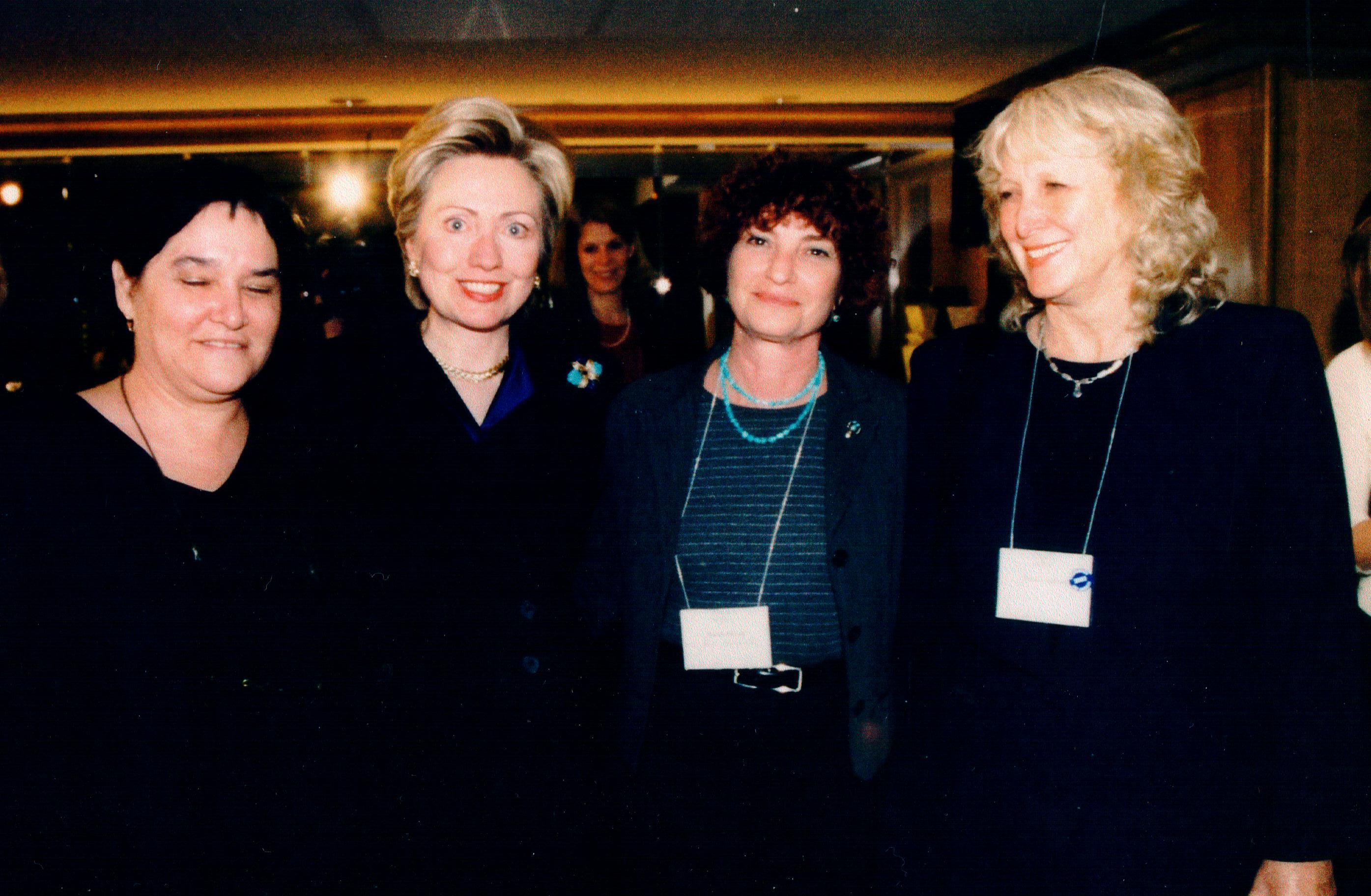Israeli feminist sociologist Hanna Herzog, second from right, with, from left, Prof. Hannah Nave, then-First Lady Hillary Rodham Clinton, and Prof. Ariella Friedman, at a meeting of National Council of Jewish Women members in New York, 2000. Courtesy of Hanna Herzog.