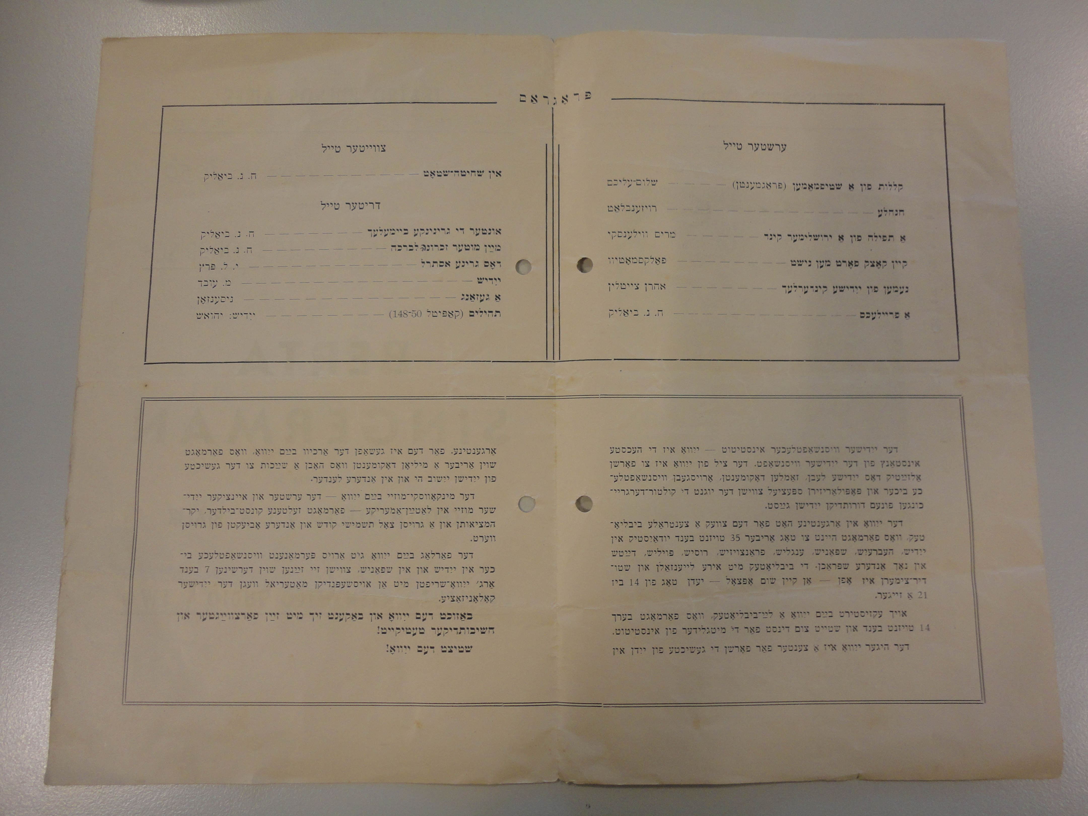 Interior of program for Argentine actress and poetry reciter Berta Singerman's 1959 program in memory of Scholem Aleichem and Chaim Nachman Bialik. Courtesy of Dr. Paula Ansaldo.