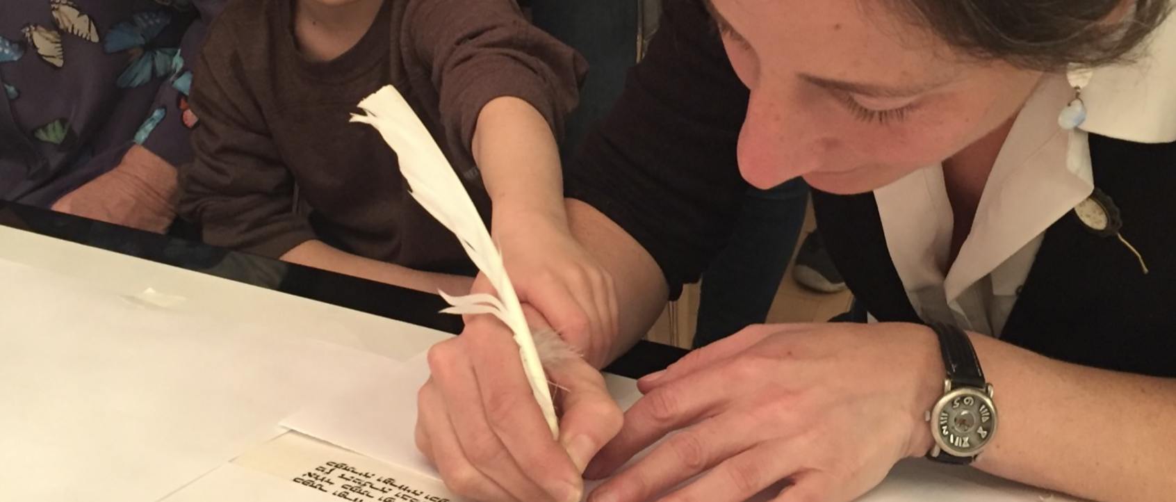 Julie Seltzer writing Torah with child Print Full Image Rights JWA use only on jwa.org Related contentPodcast: Episode 127: The Scribe and Her Quill