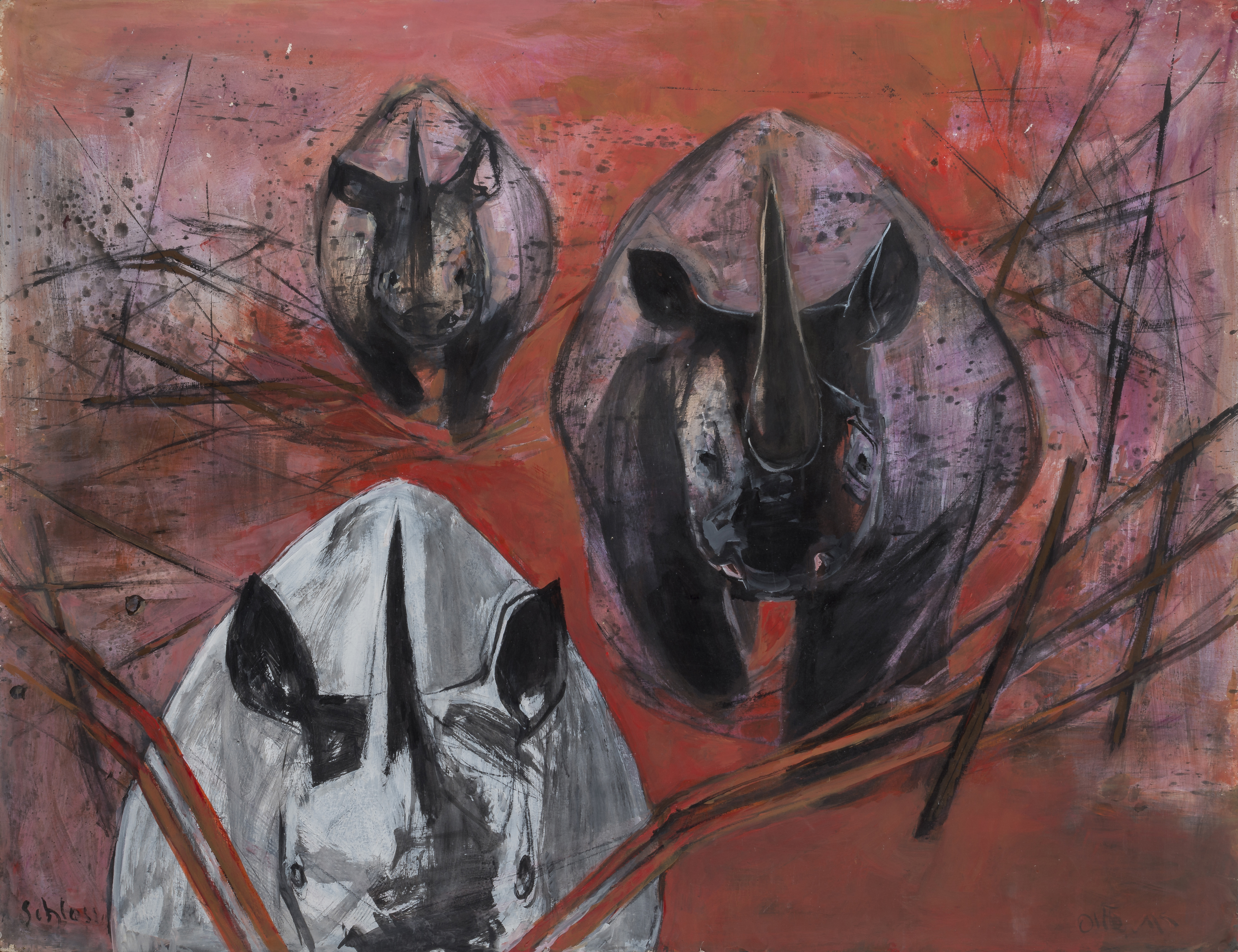 Israeli artist Ruth Schloss’s Rhinoceroses, 1989, acrylic on paper, 127x128 cm. Courtesy of Nurit Cohen Evron.