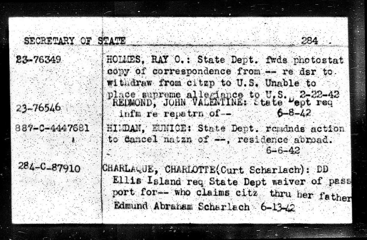 Card from the office of the US Secretary of State indicating Charlotte Charlaque requested a State Department waiver of an Ellis Island passport requirement and claiming US citizenship through her father, June 13, 1942. From the Immigration and Naturalization Service Files.